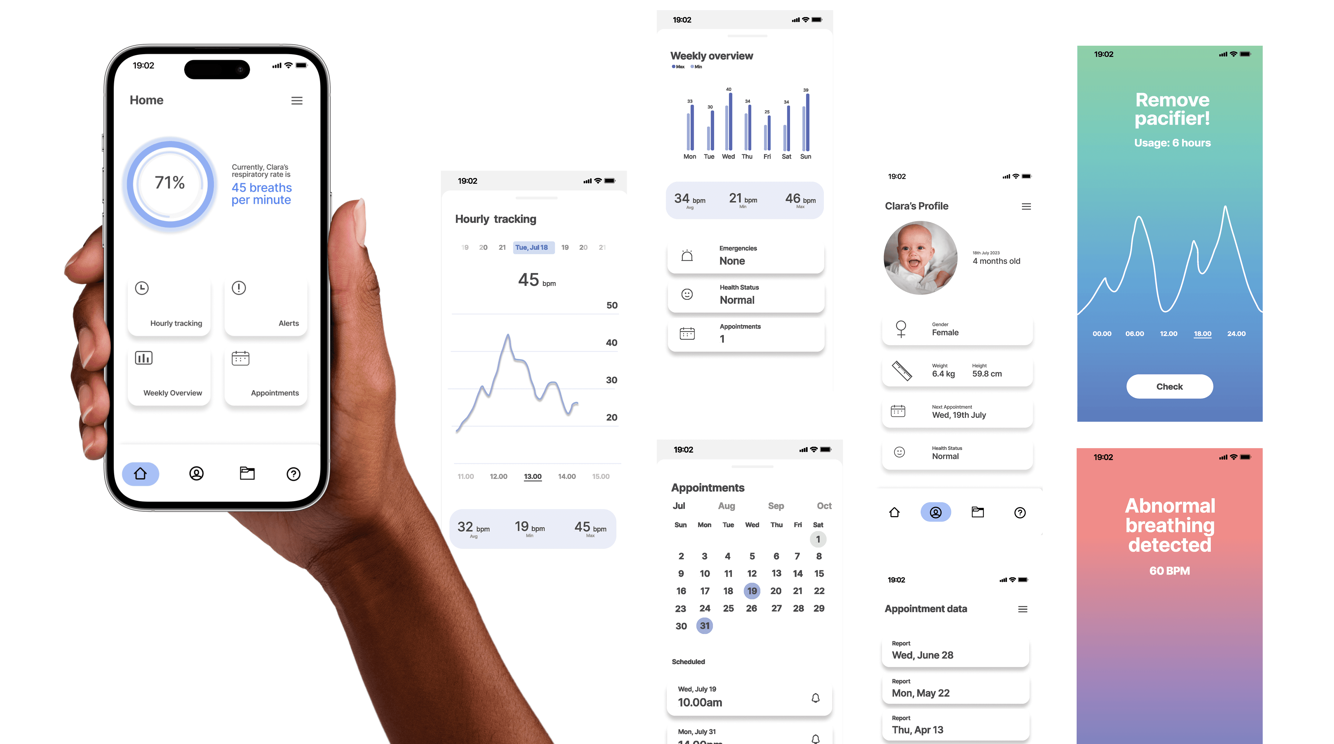 The concept was built through extensive research into infant respiratory illnesses, current monitoring devices, and the drawbacks of existing pacifiers and wearables. I explored how smartphone microphones could reliably detect breathing patterns. Early sketches and system maps defined how the pacifier would integrate with a mobile app, promote healthy usage, and streamline data for caregivers. The development focused on creating a solution that was realistic, medically informed, and grounded in everyday parenting behavior.