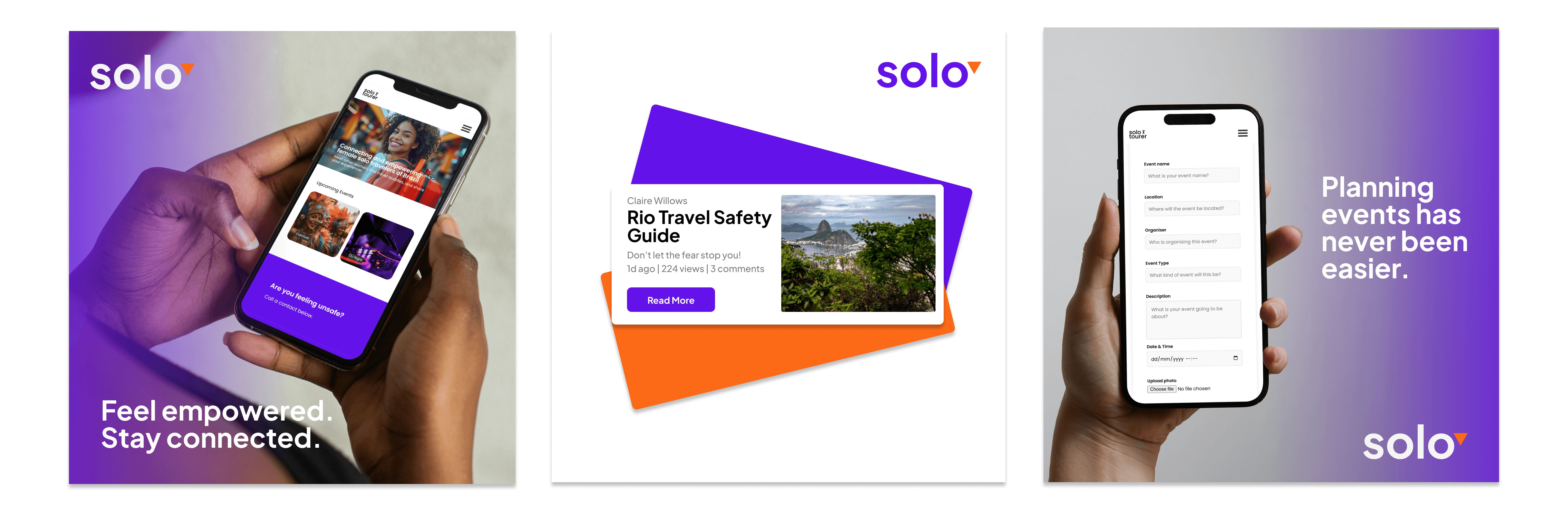 As an extension of the community platform, I developed a branding and social media concept that explores how the identity of the female solo traveller community could live beyond the website. The work focused on translating the platform’s core values such as, safety, trust, connection, and empowerment, into a cohesive visual language across social media, merchandise, and brand touchpoints.